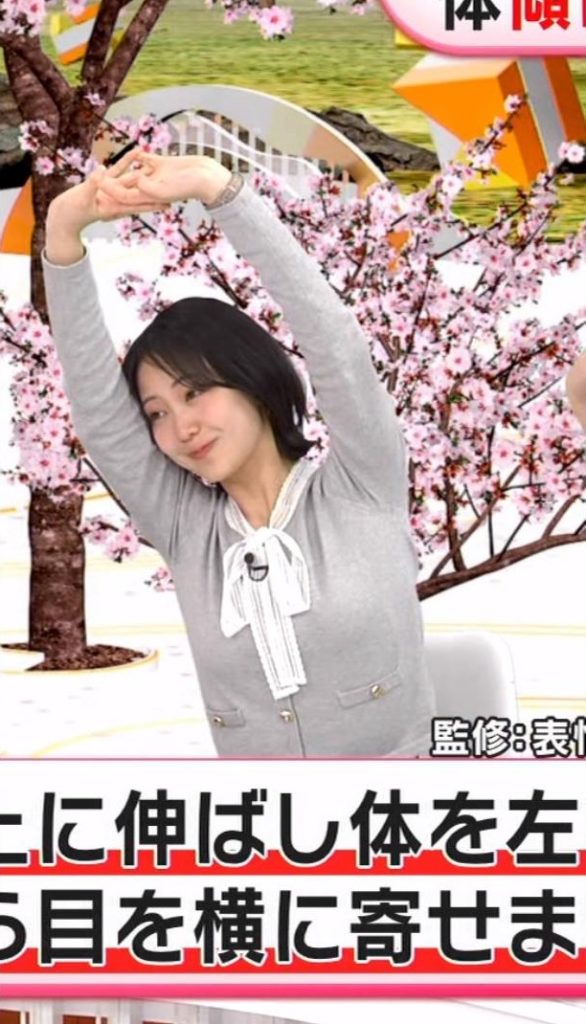 くっきりニットで体を反らして更にくっきりした高崎春アナ